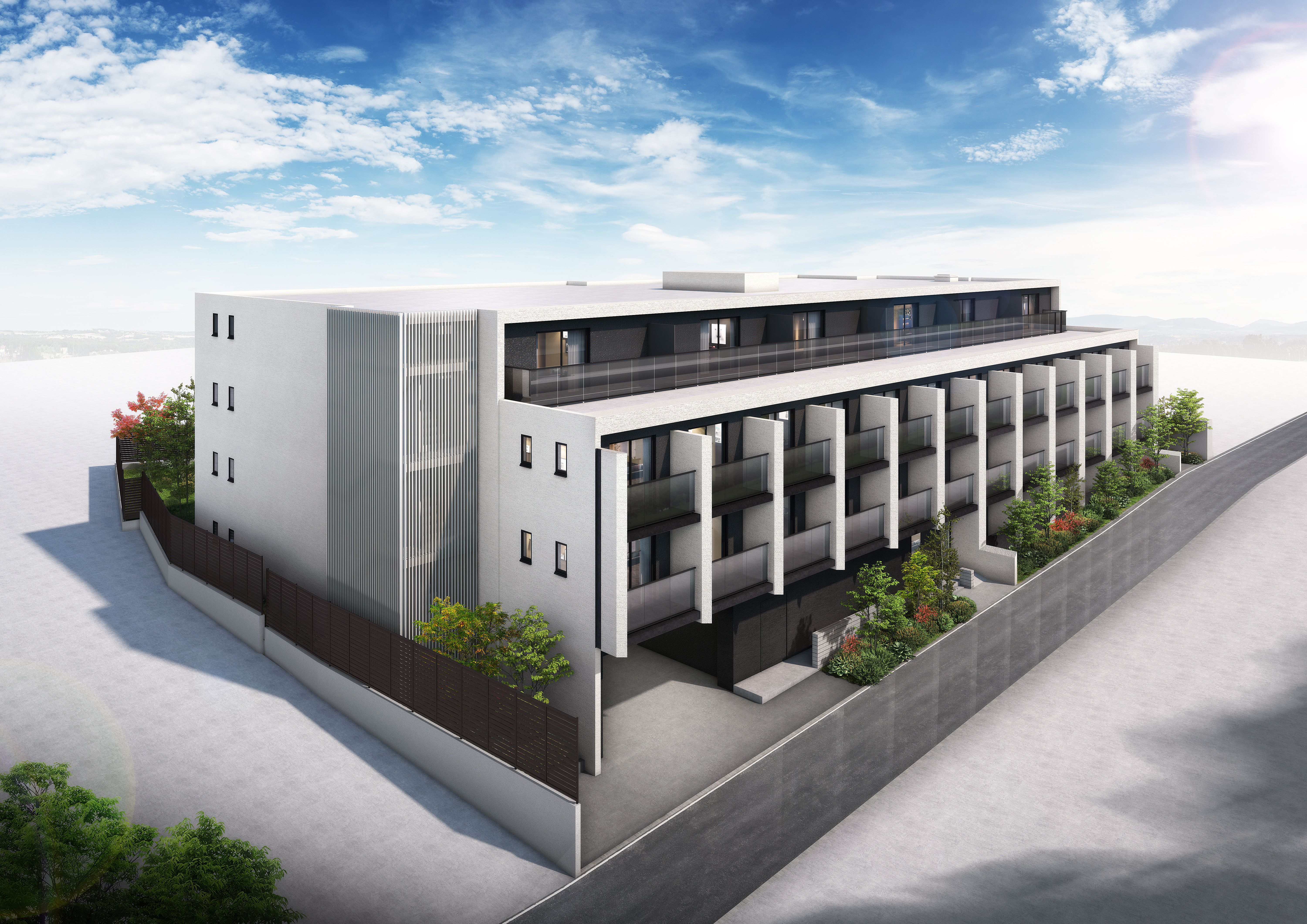 白を基調とした外壁に、ガラスバルコニーの透明感がアクセントを